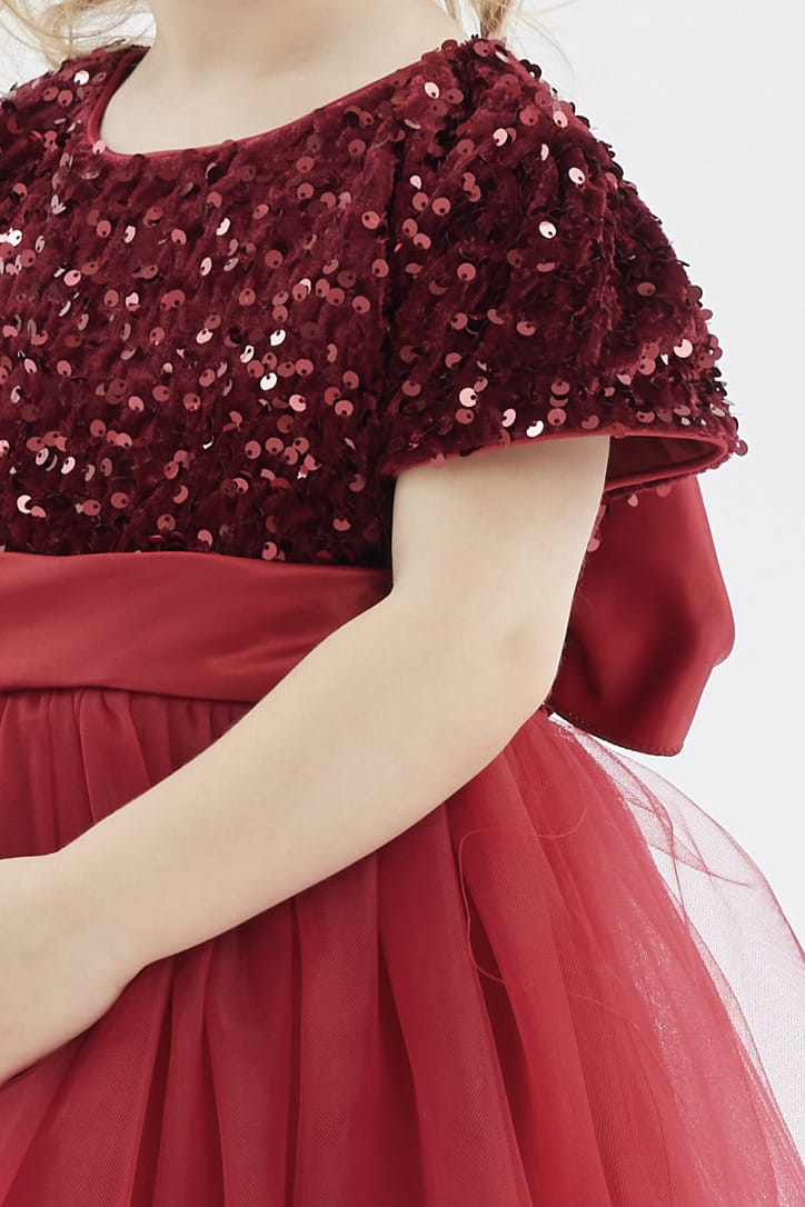 Φόρεμα για κορίτσια Ελίζα σε χρώμα μπορντό. Αυτό είναι το φόρεμα Ελίζα - ένα εξαιρετικό παράδειγμα παιδικής επίσημης μόδας, που μετατρέπει κάθε μικρή κυρία σε μια αληθινή πριγκίπισσα. Το βαθύ της μπορντό χρώμα, σε συνδυασμό με τα λαμπερά παγιέτες, την καθιστούν έργο τέχνης που προσελκύει τα βλέμματα και προκαλεί θαυμασμό.